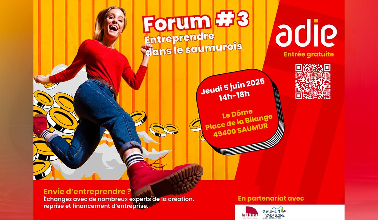L’ADIE (Association pour le Droit à l'Initiative Économique), en partenariat avec la Communauté d’Agglomération Saumur Val de Loire, organise la troisième édition du forum "Entreprendre dans le Saumurois" le jeudi 5 juin 2025 de 14h à 18h, au Théâtre le Dôme à Saumur.